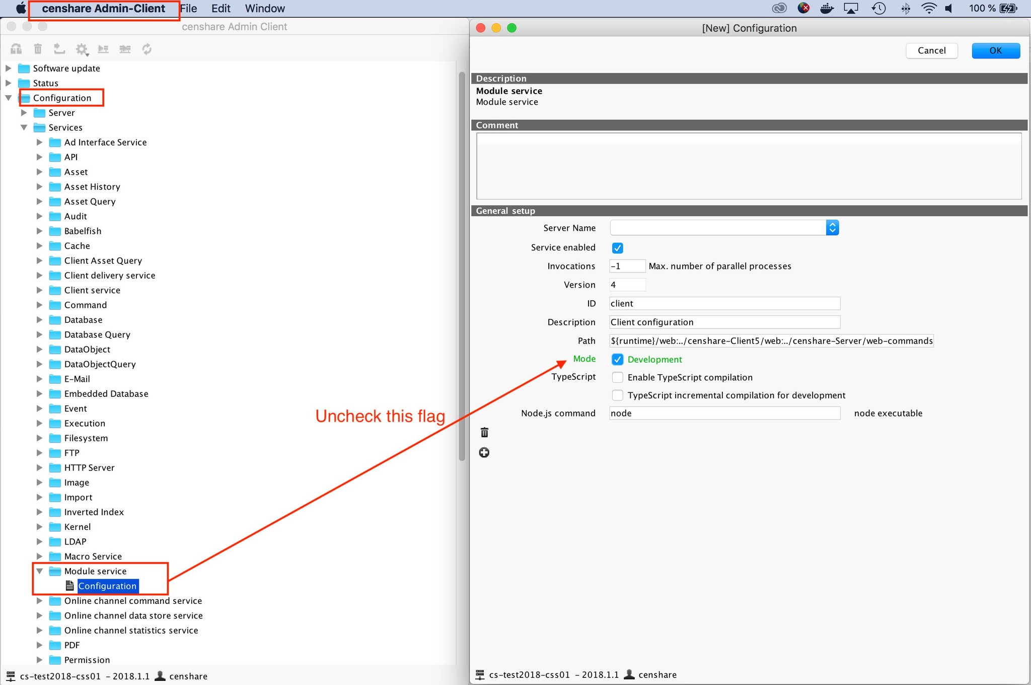 To avoid this problem, you would need to uncheck the Mode Development Flag in the changed ModuleService configuration on the Admin Client as shown below: