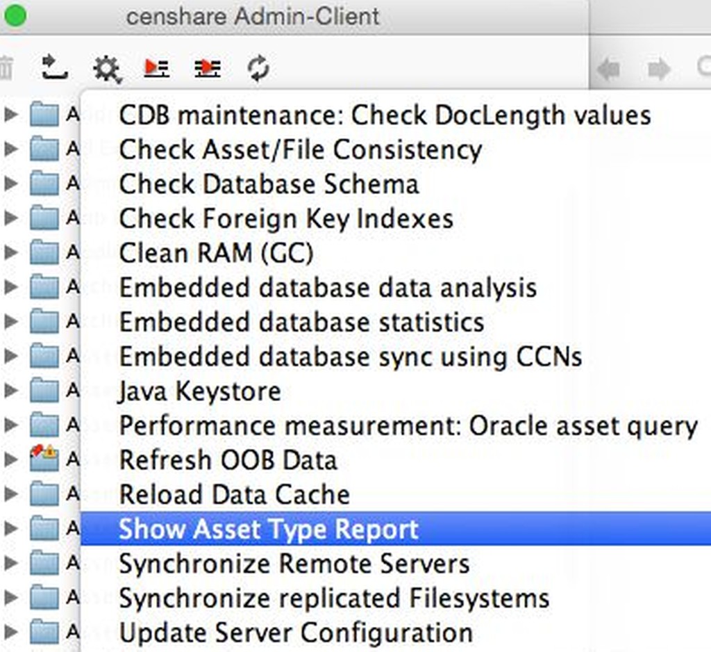 You can achieve this using the server action "Show Asset Type Report" from the censhare Admin-Client. If you do not find the server action, it is most probably disabled and you will have to enable it. Go to 'Configuration --> Modules --> Asset Type Report --> Show Asset Type Report' and enable it. Now you will see this option in the list of manual server actions.