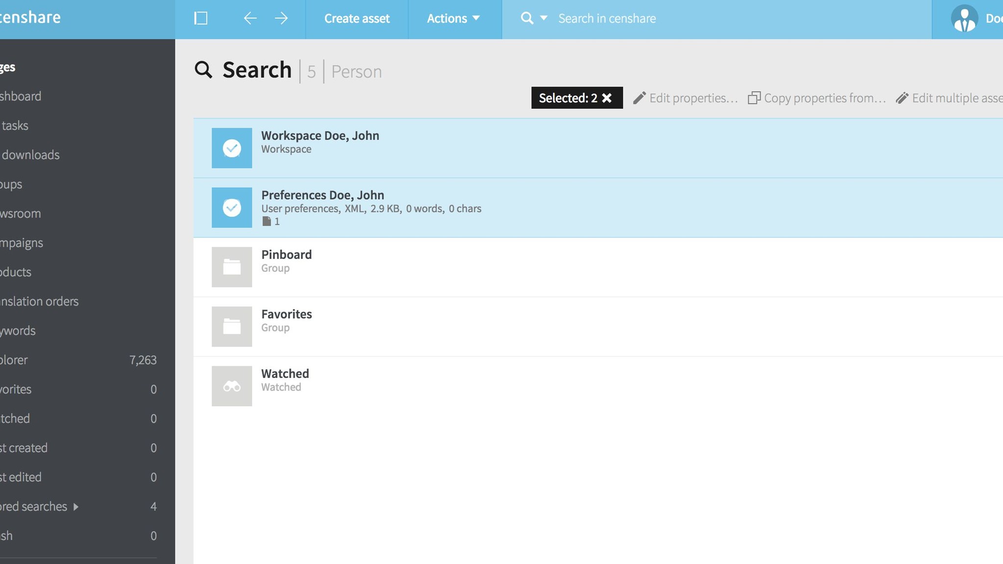 The corresponding person asset will show up. Search for the child relations to this asset, the Workspace and Preferences assets will be listed under the "Assigments" relations.