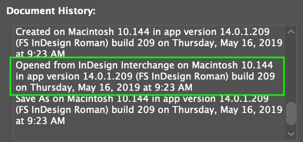 Please be aware of doing an IDML export kills the previous layout history. So after an IDML export, the second line in history always will show "Opened from InDesign Interchange". This is the hint the layout was saved as IDML before.