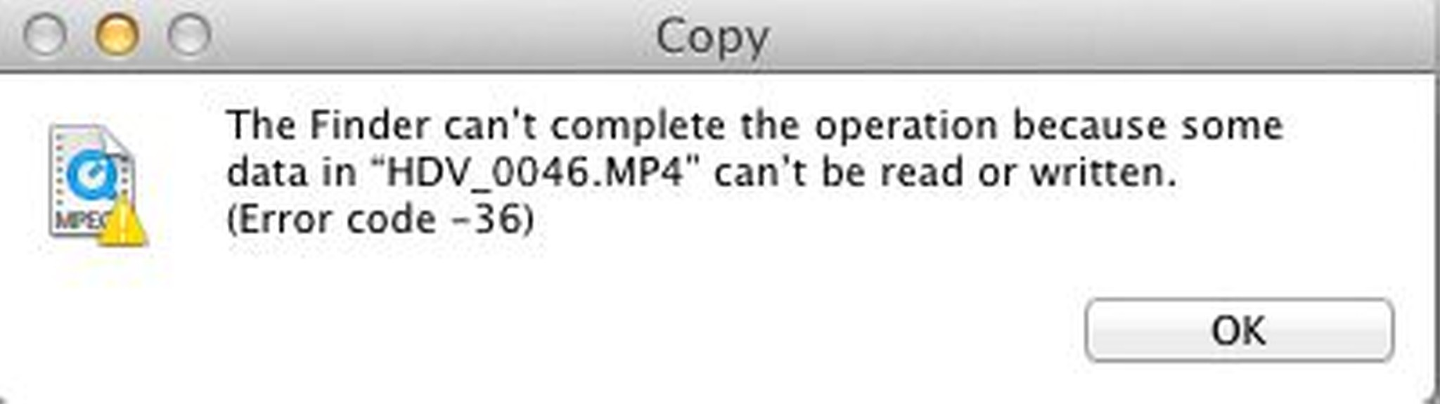 Finder error -36 when copying. This I/O message comes from the OS X Finder and not from censhare and indicates that a file cannot be written to the end without error.